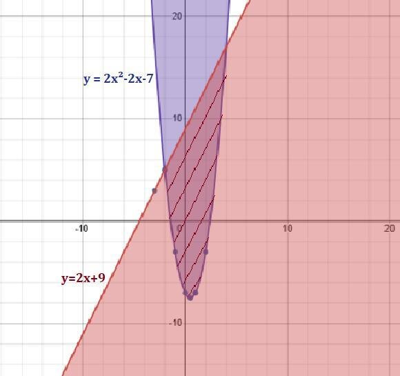 Изобразить область , заданную на координатной плоскости системой неравенств y ≤ 2x + 9, y ≥ 2x² - 2x - 7