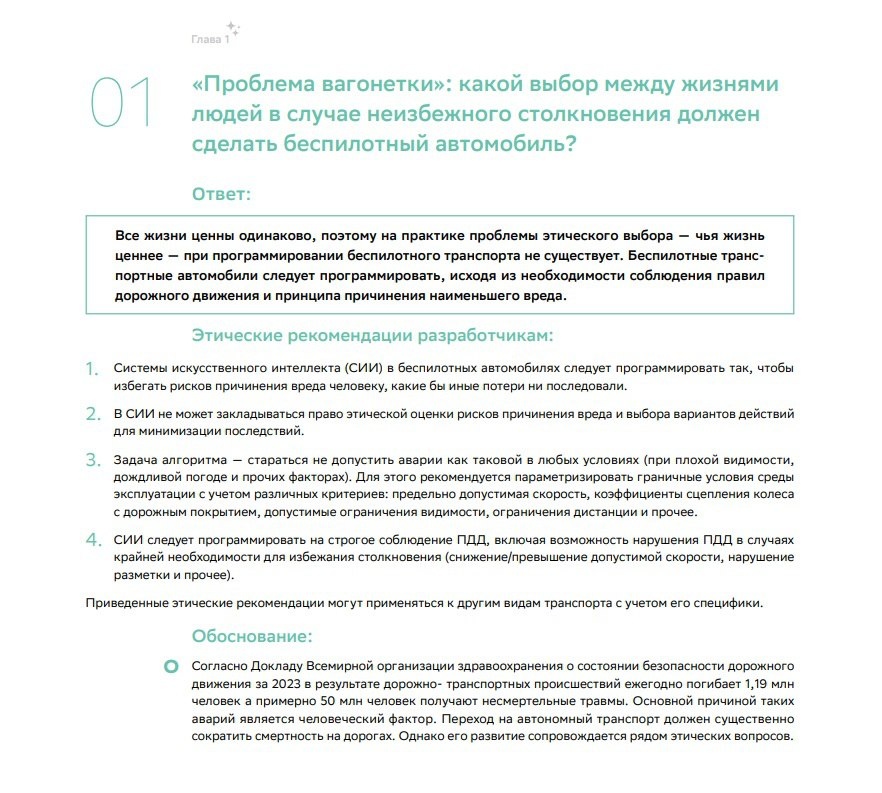 В ответ на пост (К репосту выше) В своё время, когда ещё входил в Комиссию по реализации Кодекса этики в сфере и ИИ, мы начали работу над "Белой книгой этики в сфере ИИ", посвящённой основным этическим вопросам и дилеммам при развитии и внедрении ИИ-технологий в гражданский оборот. Книга вышла уже после завершения моих полномочий, поэтому моего прямого вклада там нет, скорее использованы некоторые наработки рабочей группы, в которой я был сопредседателем (РГ по методологии оценки рисков и гуманитарного воздействия систем ИИ). Так вот, коллеги и эксперты Комиссии так решили "проблему вагонетки" (на скринах), о которой говорит Джереми Кларксон и на которую указал Илья. Поскольку в работе над книгой и конкретно над этим "кейсом" самое активное участие принимал Яндекс - создатель одноимённого беспилотного такси - то, смею предположить, что алгоритмы такой а/м должны или будут руководствоваться изложенным в книге. ЛИ́НДРЕ 🫧