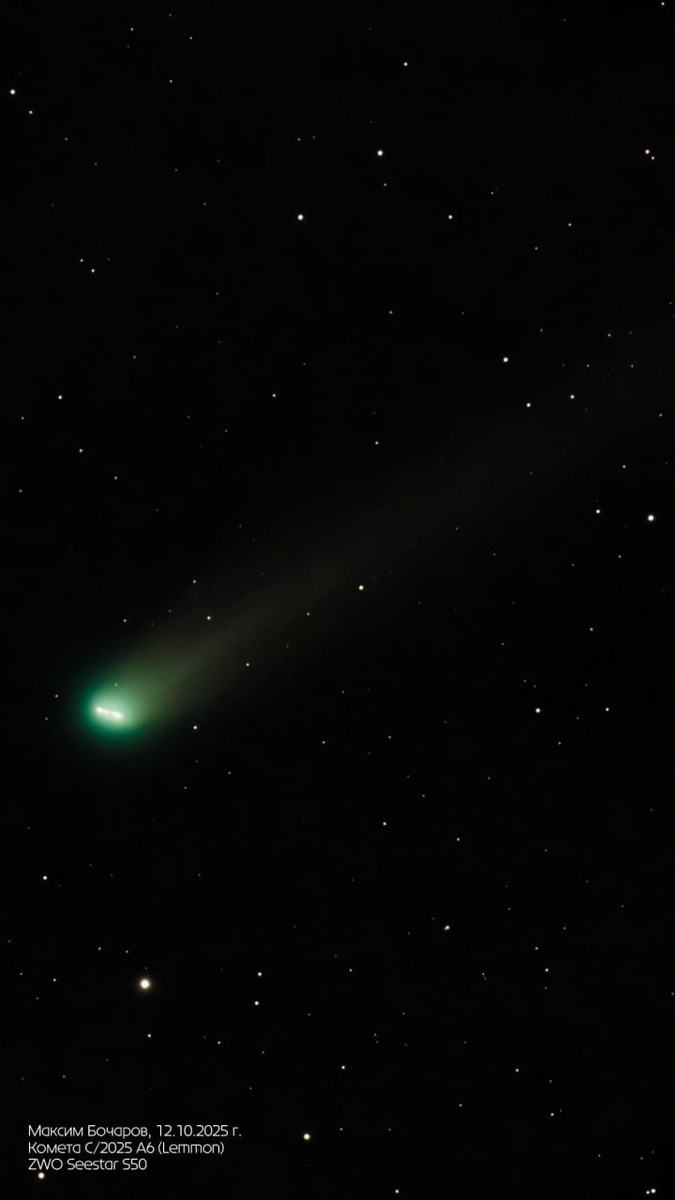 Астроном-любитель заснял самую яркую и редкую комету года В ночь с 11 на 12 октября над небом Енисейска (Красноярский край) пронеслась комета C/2025 A6 (Lemmon), признанная самой яркой в этом году. Это поистине уникальное небесное явление, которое, по оценкам астрономов, можно наблюдать лишь раз в 1350 лет. То есть никто из ныне живущих её больше не увидит. Как сообщается, комета максимально близко подойдет к планете Земля 21 октября, что делает текущий период идеальным для её наблюдения. По словам Максима Бочарова, комету C/2025 A6 (Lemmon) уже сейчас можно разглядеть даже в бинокль – её узнают по характерному зеленоватому свечению. В телескоп же, как отмечает астроном, становится виден даже зеленый хвост этого небесного тела. Наблюдать комету в небе можно будет до 2 ноября. – Охотились мы за этой кометой достаточно давно. Не позволяла погода, было много облачных ночей, и комета до 12-го числа наблюдалась в основном на утреннем небе, а сейчас началась ее вечерняя видимость. Постеп
