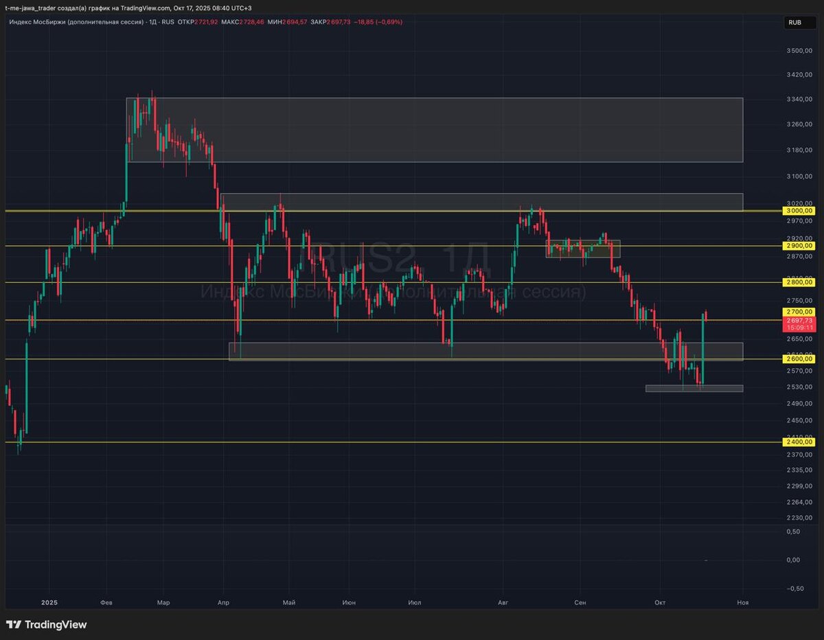 🗓 Пятница 17 октября 2025: После вчерашних новостей об итогах телефонного расзговора Путина и Трампа Индекс Мосбиржи 🇷🇺 $IMOEXF $MXZ5 $MMZ5 показал ракету не вечерней сессии 🚀🚀🚀 Одной свечой вышли выше важного уровня 2700 и начинаем закрепляться. Сегодня вполне может быть некоторый откат к вчерашнему росту, а далее жду позитивных новостей и реакции рынка на встречу делегаций и предстоящую встречу Путина и Трампа в Венгрии. Допускаю, что сегодня еще могут быть новостные вбросы с попытками показать негатив, так как сегодня встреча Трампа с Зеленским. Считаю, что нисходящая тенденция сломлена и откаты можно рассматривать для донабора позиций. Всем успешной пятницы и профита! 👉 Подпишись на Jawa Trader