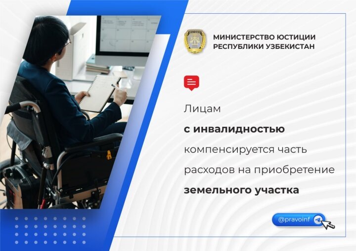 По данным пресс-службы Министерства юстиции Республики Узбекистан, в соответствии с действующим законодательством лицам с инвалидностью, а также семьям, включённым в Реестр бедных семей и имеющим в своём составе лицо с инвалидностью, предоставляется компенсация части расходов, связанных с приобретением земельного участка на электронном онлайн-аукционе.