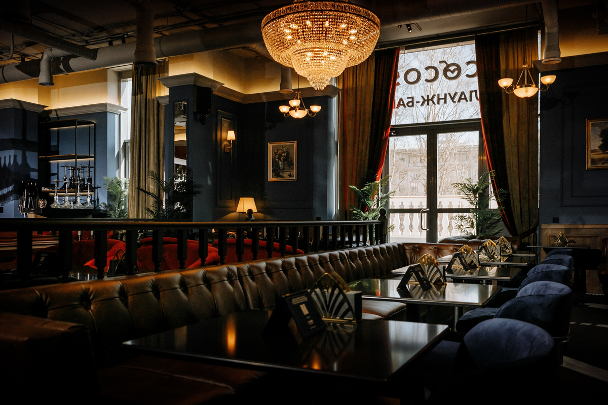 Архитектурной доминантой, вдохновившей создателей, стал сталинский ампир — торжественный и монументальный стиль, который гармонично продолжает линию всего Московского проспекта. Войдя внутрь, вы ощутите это величие: просторный зал с высокими потолками, большие роскошные люстры, наполняющие пространство тёплым, домашним светом, и красивый презентабельный интерьер с арт-элементами.