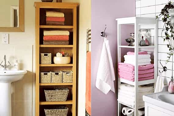 Простой способ держать всё под рукой. Сложенные полотенца легко достать, видно, сколько осталось. Такое решение хорошо смотрится в нише или на стене над раковиной.