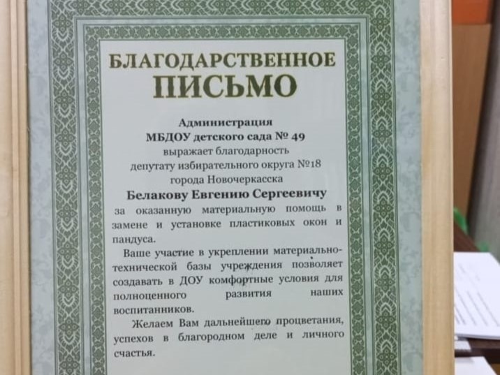 📨Администрация детского сада №49 выразила благодарность депутату городской Думы Евгению Белакову. Парламентарий оказал содействие учреждению в замене и установке пластиковых окон – из резервного фонда на эти цели было выделено 187 тысяч рублей. Также народный избранник оказал помощь в обустройстве пандуса для мам с колясками, о котором очень просили избиратели. ✉«Ваше участие в укреплении материально-технической базы учреждения позволяет создавать комфортные условия для полноценного развития наших воспитанников», - говорится в тексте благодарственного письма. Коллектив детского сада пожелал депутату процветания и успехов в делах. 🤝Детский сад №49 и Евгения Белакова связывает многолетняя дружба. Депутат принимает активное участие в помощи и оснащении помещений детсадовских групп более 10 лет. #Новочеркасск #ДумаНовочеркасска #НовостиНовочеркасска #ДепутатыНовочеркасск