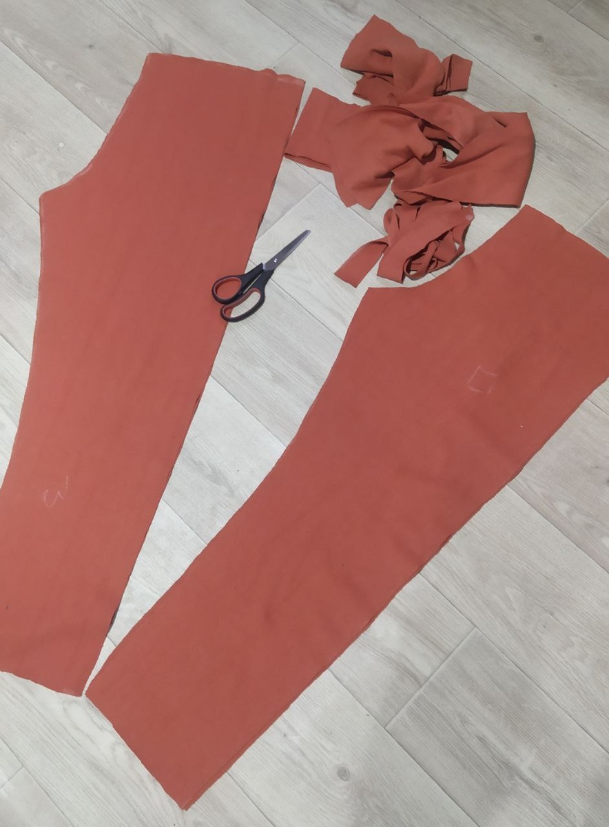 В одной из моих посылок с рандомной тканью от маркетплейса оказалась вот такая ткань кирпичного цвета в мелкий рубчик. Отрез не большой, в этих посылках бывает, что продавец положит большие отрезы, которые можно использовать для таких изделий, как платье или костюм. Но обычно это вот такие небольшие куски ткани, из которых можно сшить только одну небольшую вещь. Да и цвета бывают такие, что ума не приложишь, что из этого можно сшить. В этой же посылке был очень плотный бархат темно-зеленого цвета, ну явно остаток от обивки для мебели. Ну тут нам повезло, кожаное компьютерное кресло со временем сильно пострадало от когтей пушистиков и давно нуждалось в перетяжке. А из ткани кирпичного цвета было решено сшить домашние спортивные брюки. Такие я еще не шила, а с выкройками я пока не дружу, пришлось как обычно все по факту. Сложила ткань пополам и приложив свои любимые брюки обвела мелом для ткани. Не забывая отметить. что одно полотнище - зад, а другое - перед. В принципе можно и так отлич