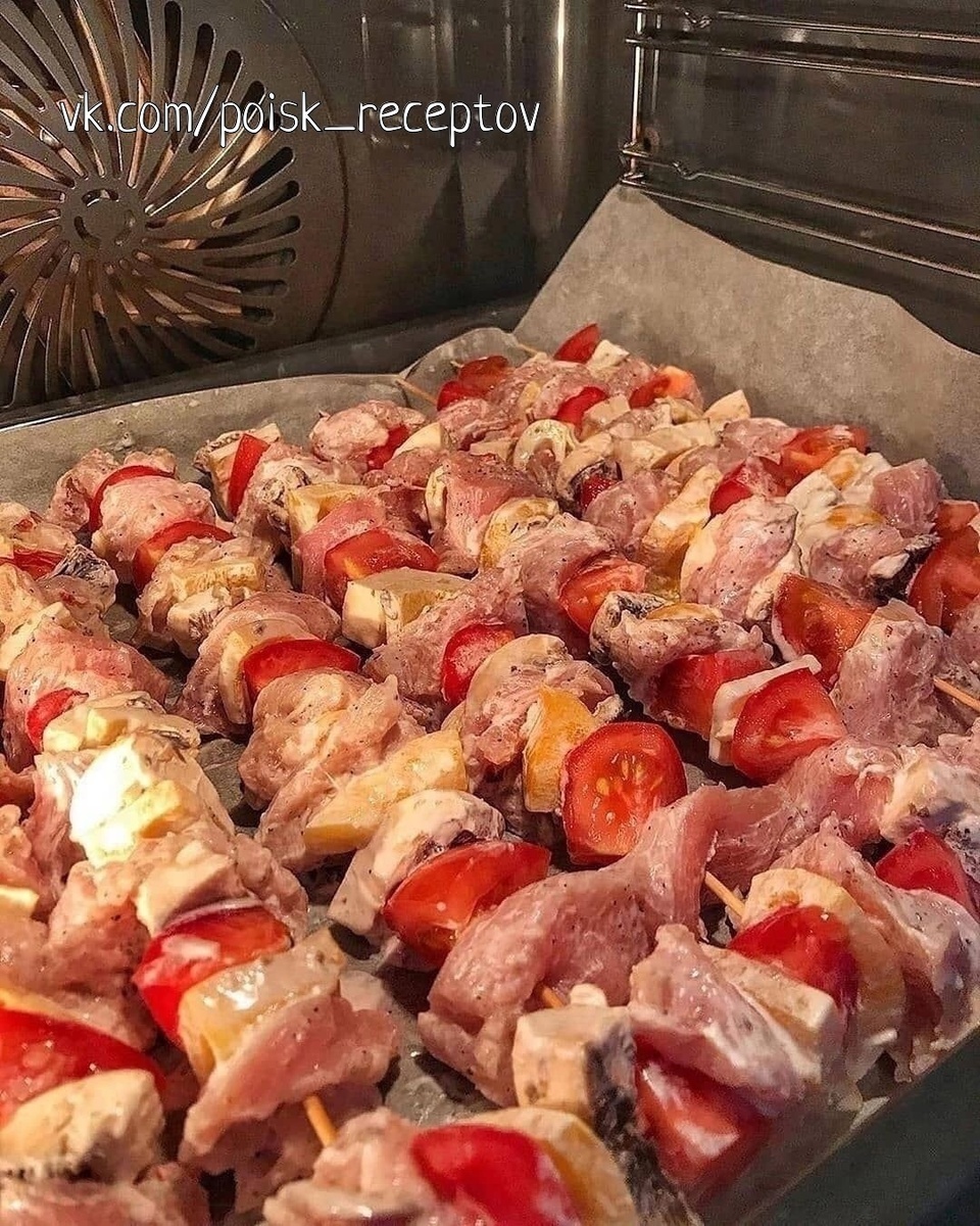 Берём шпажки и формируем шашлычки, у меня они получились яркими. Из овощей я взяла помидорки черри, болгарский перец 🌶 и шампиньоны.
