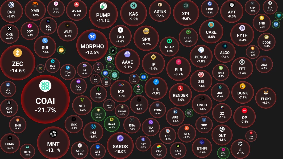 📊 Ежедневный обзор рынка криптовалют от Coinbubbles.ru 🗓 17.10.2025 09:31 по Москве. 🔗 Посмотреть на сайте 📈 Лидеры роста (из ТОП-100): 🟢 PAX Gold (PAXG): $4419 (+4.1%) 🟢 Tether Gold (XAUT): $4382 (+3.4%) 🟢 Fasttoken (FTN): $1.8611 (+2.2%) 📉 Лидеры падения (из ТОП-100): 🔴 ChainOpera AI (COAI): $17.33 (-21.7%) 🔴 Zcash (ZEC): $206 (-14.6%) 🔴 Mantle (MNT): $1.6212 (-13.1%) 🔍 Основные метрики: 🔴 Общая капитализация: $3648.43 млрд (-3.32%) 🟢 Общий объем торгов: $219.99 млрд (+11.98%) 🟢 Доминация Bitcoin: 58.96% (+0.15%) 🔴 Доминация Ethereum: 12.81% (-0.05%) 🔴 Индекс страха и жадности: 22 / 100: ЭКСТРЕМАЛЬНЫЙ СТРАХ (-6) 🔴 Индекс Альтсезона: 26 / 100: НЕ АЛЬТКОИН-СЕЗОН (-1) 📖 Интересные статьи: 👉 Абстракция сети в Web3: Единый интерфейс для всех блокчейнов — будущее криптовалют. 👉 Сравнение популярных криптовалютных бирж. Выбираем лучшую биржу для майнера и трейдера. 😻 Наши сервисы и бонусы: 👥 VK - наша группа в VK 📈 Binance - 20% кешбэк на фьючерсах и 10% кешбек