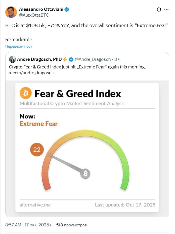 BTC торгуется на уровне $108,5 тыс., что на 72% больше, чем в предыдущем году. Общее настроение — «крайний страх».