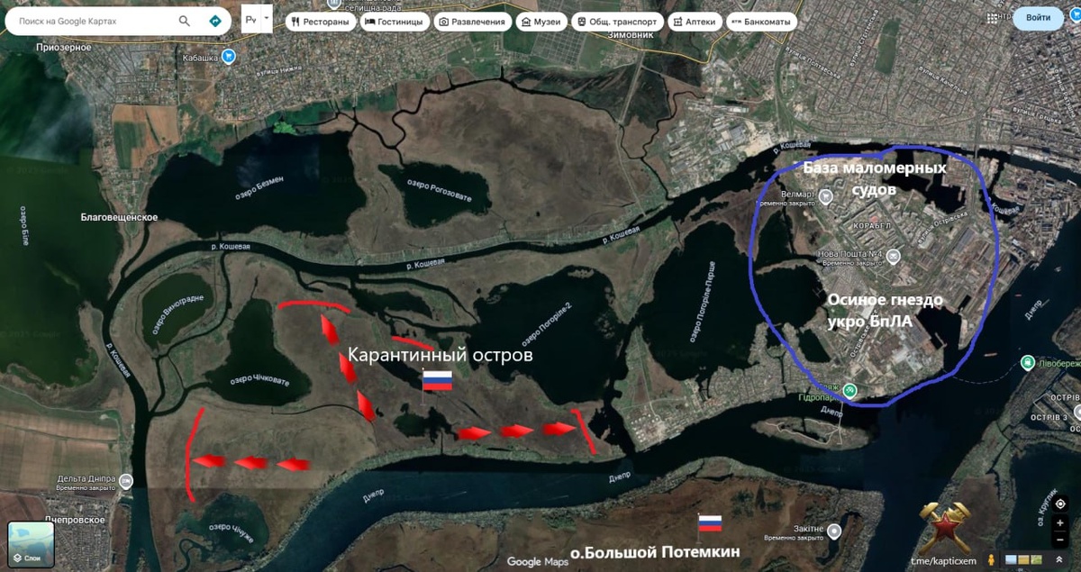 В ответ на пост Херсон. Остров Карантинный Подтверждается с мест, что ВС РФ ведут успешную зачистку острова, вводят дополнительные силы, формируют систему обороны, на случай попыток отбить территорию. Хочется отметить боевое настроение ребят, что наконец то и тут пошло движение. Карантинный примыкает к острову Корабел, где находится база легких скоростных катеров и моторных лодок. Отсюда противник совершает вылазки и на острова дельты Днепра и на наш берег. схемы и карты