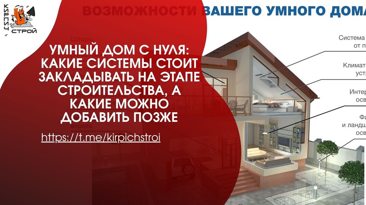 Умный дом с нуля: планируем автоматизацию. Современные технологии всё глубже проникают в нашу повседневную жизнь, и концепция «умного дома» уже не кажется чем-то фантастическим. Как специалисты с 10-летним опытом в строительной сфере, мы поможем разобраться, какие системы действительно стоит закладывать на этапе строительства, а с какими можно подождать. Совет от профессионалов: При проектировании электрики закладывайте мощность с запасом минимум 30%. Современные устройства требуют всё больше энергии, и лучше иметь резерв, чем потом переделывать проводку. Подробнее о концепции умного дома можно прочитать в Википедии При грамотном планировании умный дом становится не роскошью, а практичным решением для комфортной жизни. Главное — правильно расставить приоритеты и начать с базовых систем, постепенно расширяя функционал. Компания «Кирпич Строй» всегда готова проконсультировать вас по вопросам строительства и помочь с выбором материалов для реализации проекта умного дома. Наш опыт работы
