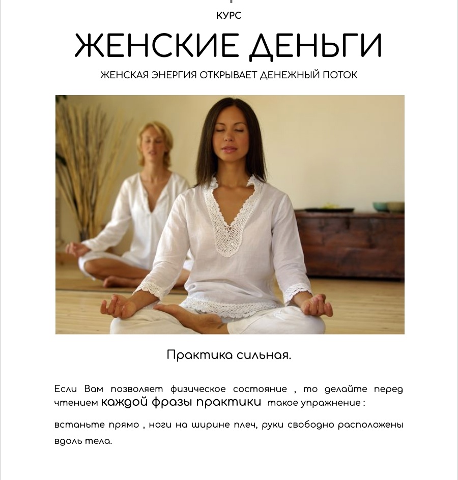 ЧЕРЕЗ СВОЮ ЖЕНСКУЮ СИЛУ - ЖЕНЩИНА МОЖЕТ ТВОРИТЬ ЧУДЕСА! Женская энергия имеет свои уникальные особенности и их важно знать, чтобы быстрее и легче женщина смогла получить желаемое благополучие в важных сферах жизни, реализовать свою женскую притягательность и стать , быть счастливой и богатой женщиной . Дорогие мои девочки , вот все женские курсы - с практиками / телесными , кодами , молитвами, медитациями и аффирмациями/ - для женского здоровья и благополучия. / проведу для Вас по Вашему желанию / Коррекция сфер жизни через женскую энергию, знания о женской энергии - как она реализуется в сферах жизни + 10 материалов с практиками для денег - 20 дней , 20 файлов, мои консультации по темам курса. - практики активации женской силы , женской энергии денег , здоровья , внутреннего баланса , притягательности - женская сила для счастливой жизни женщины. КУРС ВОТ ТУТ - 20 файлов с сильными практиками - полная трансформация и коррекция денежной сферы через женскую энергию . Сильные поток