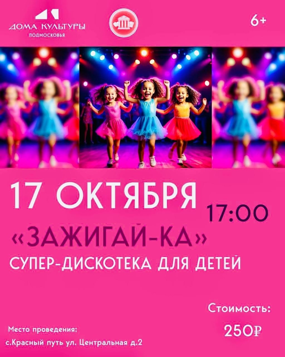 ✨ СДК «Русь» приглашает 🥳🥳🥳🥳🥳🥳🥳🥳 «Зажигай -ка!» - отрываем сезон ярких, весёлых, незабываемых дискотек! И первая дискотека объявляется «Шляпной» 🥳🥳🥳🥳🥳🥳🥳🥳 В программе: 🥳 игры и конкурсы😊 🥳флешмобы💃 🥳игра «Почта»💌 🥳мини - лотерея🎁 🥳бумажная дискотека 🔥 Не пропустите весёлую вечеринку Осени!🥳 Самые нелепые и смешные шляпы 🎩 - получат приз🏆 🚫 Возраст: 6+ 📆 17.10.2025🕒17:00 🏢 Сельский дом культуры (СДК) «Русь» 📍 г.о.Домодедово, с.Красный Путь, ул.Центральная, д.2 💰 Цена: 250 ₽ ✅ Мероприятия Домодедово https://dzen.ru/id/66f10385cc4c5a16f7b5fb02 http://vk.com/domodedovo_events http://dzen.ru/domodedovo_events
