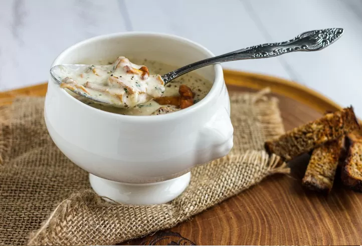 - чёрный перец 🔥 Приготовление: 1. Растопите сливочное масло на умеренном огне в кастрюле с утолщённым дном, добавьте измельчённые лук, чеснок и щепотку соли. Готовьте при постоянном помешивании 3-4 минуты до размягчения, затем введите крупно нарезанные лисички. Обжаривайте примерно 10 минут, пока не испарится основная часть жидкости, выделенной грибами.