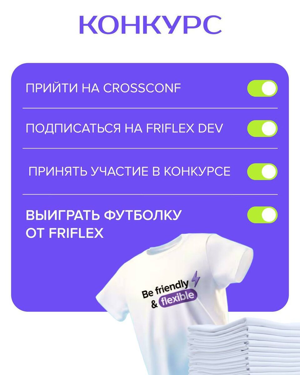Конкурс для friendly & flexible и всех тех, кто сегодня с нами на CrossConf Есть вероятность, что вы уйдете сегодня в фирменной футболке Friflex. Что для этого нужно сделать: ✅Подписаться на наш канал @Friflex печатает... ✅Написать в комментариях, какой поток пришли сегодня послушать Троих победителей определим с помощью генератора случайных чисел в 18:00. Забрать свой приз можно будет на стенде Friflex. Просто пообщаться и сыграть с нами в мемори тоже заглядывайте🚀