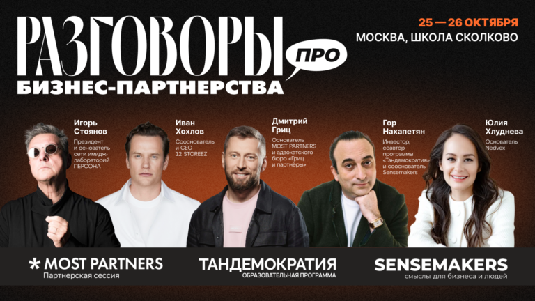 Честными историями о партнёрстве в бизнесе поделятся Дмитрий Гриц, Иван Хохлов, Гор Нахапетян, Игорь Стоянов, Юлия Хлуднева и другие спикеры.