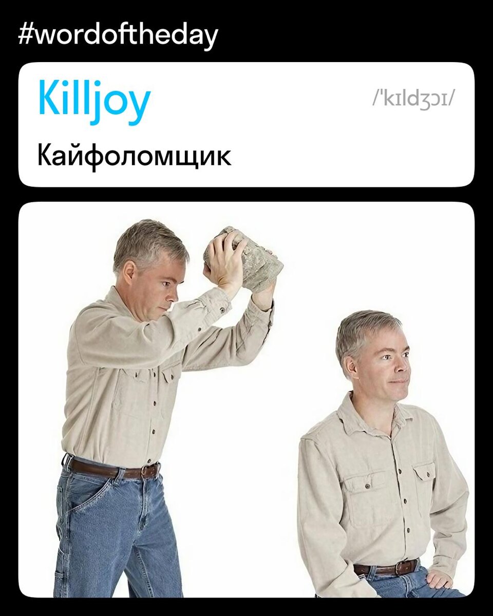 Killjoy — это тот человек, который приходит на вечеринку и первым делом говорит: «А можно потише? У меня уши болят». Говоря проще, это зануда, тот, кто портит всё веселье и гасит любой движ. Таких ещё, кстати, называют party pooper /ˈpɑːrti puːpər/ 💩 🎁 Ещё 1000 самых распространённых английских слов 👉 https://go.skyeng.ru/17words10tg