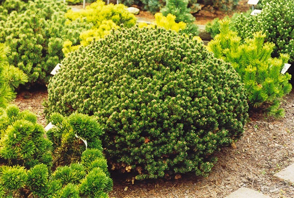 - Высота взрослого дерева варьируется от 0,2 до 0,8 метра, диаметр кроны примерно такой же. - Крона отличается равномерностью формы и густотой. Её структура представлена плотными прямыми веточками и короткими жёсткими иглами зелёного цвета. - Годовой прирост крайне незначителен — всего лишь около 5 сантиметров, что позволяет сохранять аккуратную геометрически правильную форму естественным образом.