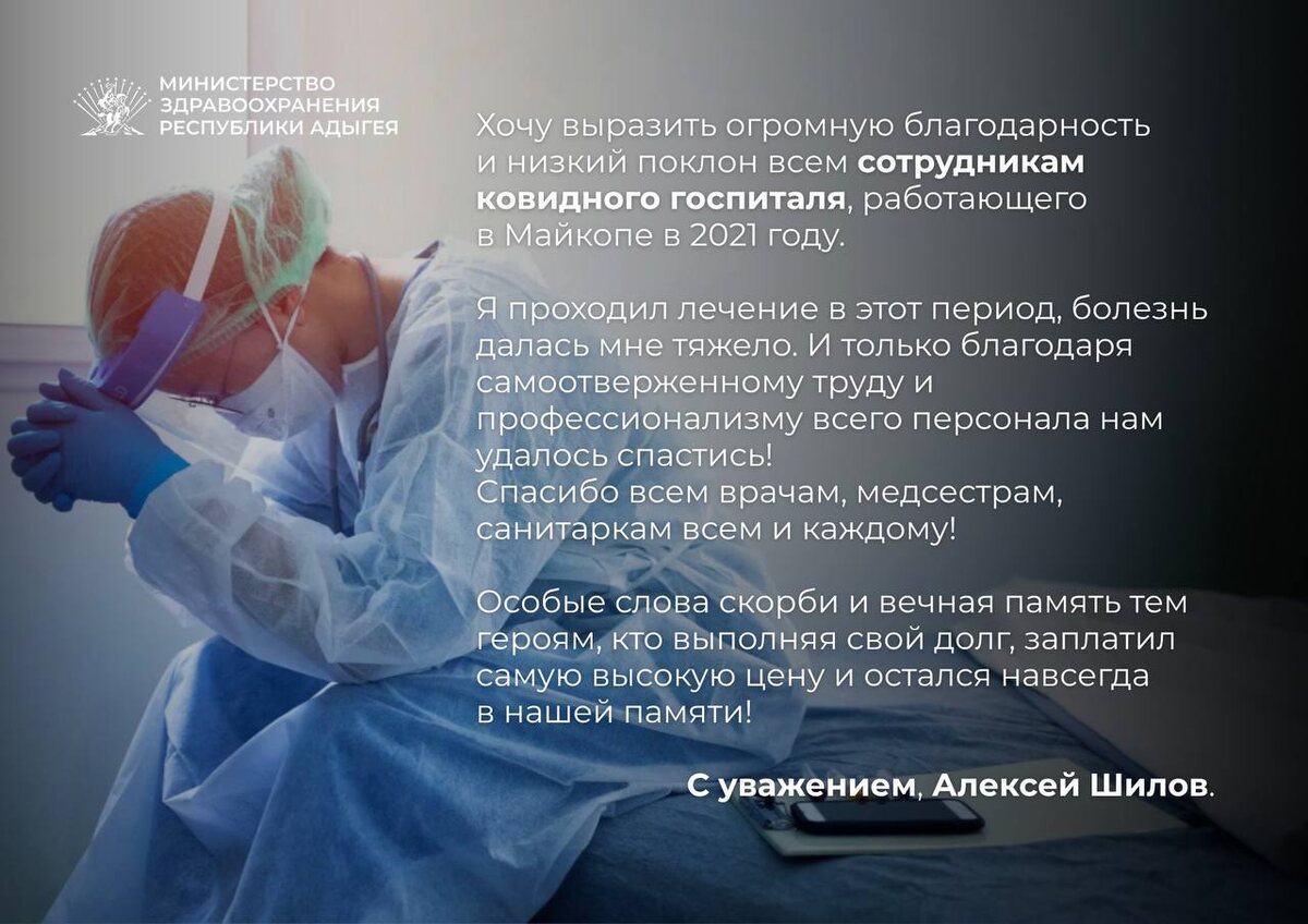 В министерство здравоохранения поступило обращение с просьбой опубликовать благодарность медикам городского ковидного госпиталя, который в 2021 году принимал основную часть «тяжёлых» пациентов. Одним из них был житель Майкопа — Алексей Шилов.