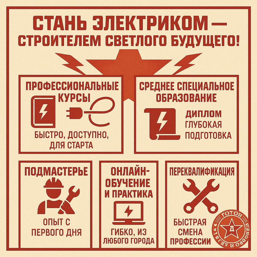 Топ-5 способов стать электриком в 2025 году: с нуля до профессии мечты Электрик — одна из самых востребованных профессий на рынке труда. С развитием «умных» домов, электромобилей и возобновляемой энергетики спрос на квалифицированных специалистов только растёт. Но как стать электриком, если у вас нет опыта? Рассказываем пять проверенных путей — от быстрого старта до карьерного роста. 1. Пройти профессиональные курсы Самый популярный и быстрый способ — записаться на курсы электрика. Современные обучающие центры предлагают программы от 1 до 6 месяцев, сочетающие теорию и практику. Вы получите базовые знания по электробезопасности, чтению схем, монтажу проводки и работе с инструментами. Многие курсы заканчиваются выдачей удостоверения и даже помогают с трудоустройством. Плюсы: быстро, доступно, без отрыва от работы. Минусы: ограниченный уровень глубины знаний (подходит для старта). 2. Получить среднее специальное образование Колледжи и техникумы по специальности «Мастер по ремонту и