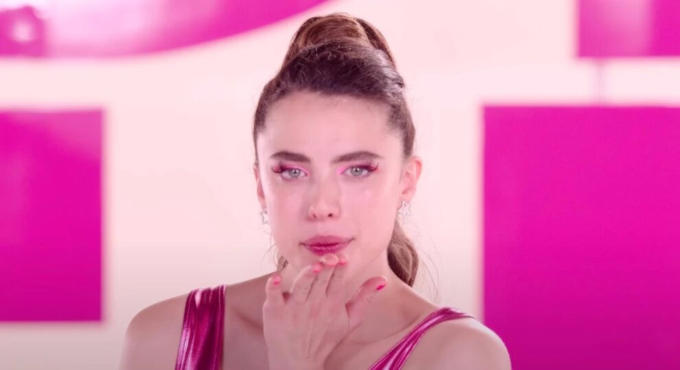 Как повторить: используйте ярко-розовые тени, помаду и сделайте высокий гладкий хвост. И не забудьте про розовое боди или платье.