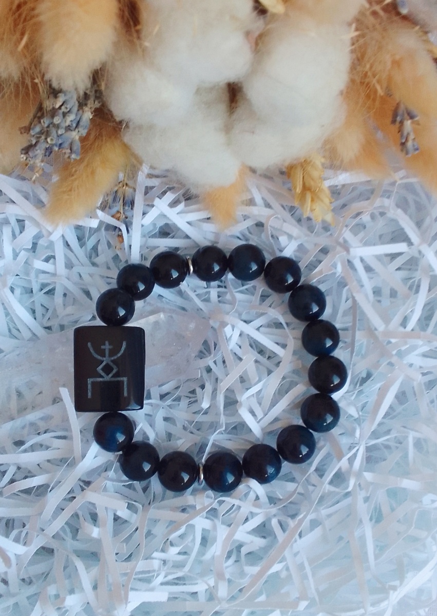 Браслет состоит из натурального камня соколиный глаз и руны «Победа».
