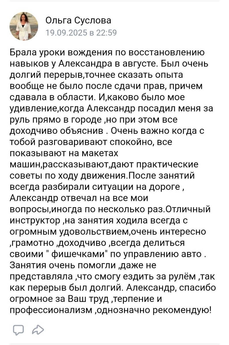 Ольга, огромное спасибо за такой душевный и подробный отзыв! 😊 Вы — настоящий пример того, как даже после долгого перерыва можно уверенно вернуться за руль. Ваша история — это лучшая иллюстрация моего подхода! 🙂 Я вижу свою задачу именно в том, чтобы создать для каждого ученика такую атмосферу спокойствия и понимания, где даже самый большой страх превращается в уверенность. 🙌 Страх: «Долгий перерыв,опыта нет, не представляла, что смогу». Решение: Авторская методика: макеты для понимания азов ➡️ практика в городе с первого занятия ➡️ спокойный диалог и детальный разбор всех ситуаций. Результат: Уверенное вождение и огромное удовольствие от процесса! 🚗💨 Я всегда уверен: не бывает «неспособных», бывает неправильный подход. Ваш успех — лучшее тому доказательство! 👍 Хотите также побороть свой страх и начать ездить по Костроме с комфортом? Ваше место в автомобиле уже ждет! 🚨 Записывайтесь на уроки вождения на АКПП онлайн, и мы так же подробно и спокойно разберем именно вашу ситу