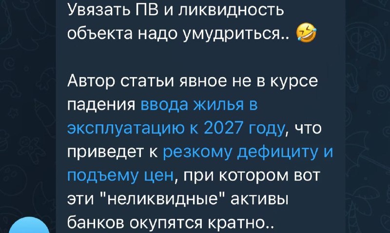 Первый скрин комментарий к моему посту о ПВ. Второй и третий этот вот ссылка из комментария. Видео тоже по ссылке из комментария. А теперь мой ответ. Если увязывать ПВ и ликвидность надо умудряться, то желаю всем, наконец, стать мудрыми, притупиться можно от простых графиков роста цен, которые вам продавцы недвижимости и инвест стратегий в бетон рисуют. Честно, даже не знаю как еще прокомментировать эту связь ПВ и ликвидности залога, по моему в посте все по русски написал. Автор в курсе мифологемы о дефиците жилья. Эту сказку застройщики, риэлторы, и, сидящие на подсосе у них, некоторые члены правительства толкают уже давно. Только не сопоставляют, почему-то, непроданный объем. И забывают что есть такая штука как спрос. Они ведь просто прикладывают линейку к графику на восходящем тренде, как будто он вечный. Сейчас это вдвойне смешно, потому что график подупал. На видео наш главный комик рынка жилья Никита Стасишин прилюдно сел в лужу, потерявшись на мягкую повторную просьбу прокомм