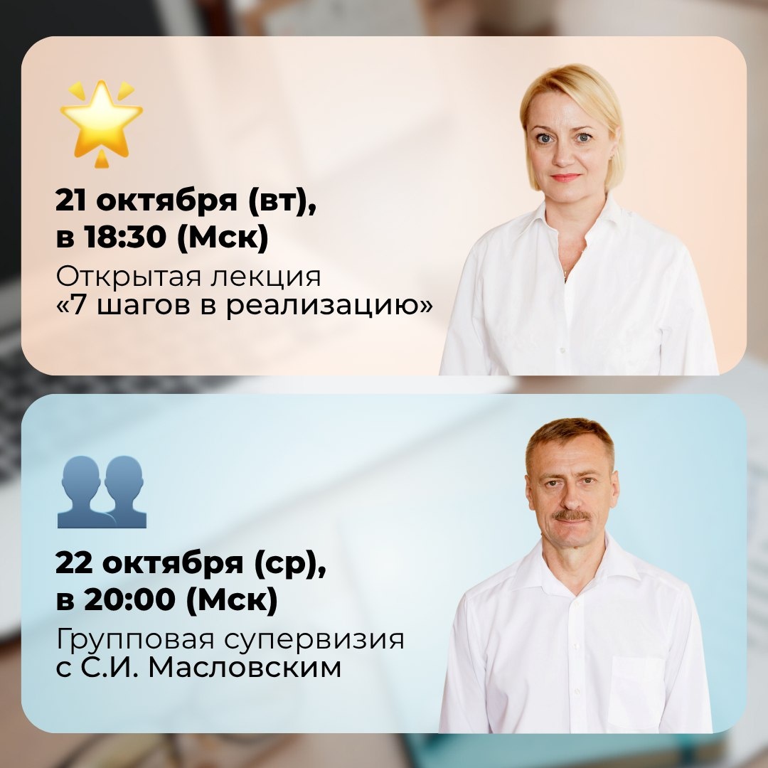 Приглашаем вас познакомиться с собой ближе Вы задумывались над тем, что значит реализовать себя? Для каждого это понятие индивидуально: для одних — это карьерные достижения, для других — финансовое благополучие, для третьих — создание крепкой семьи или воспитание детей, а кому-то важен общественный статус и признание. Но как понять, какой именно путь подходит вам? ⭐️ Открытая лекция «Семь шагов в реализацию» ⭐️ Присоединяйтесь к нашему мероприятию, которое состоится во вторник, 21 октября, в 18:30 (Мск)! Проводит Юлия Масловская. Мы обсудим семь ключевых этапов развития личности, которые формируют ваш внутренний потенциал. Понимание этих этапов позволит вам лучше осознать собственные способности и раскрыть скрытые таланты. Независимо от возраста, ваши перспективы открыты для изменений и роста. Вы сможете глубже изучить себя, разобраться в собственных желаниях и возможностях. [Зарегистрироваться на лекцию]. Эта встреча будет полезна каждому, кто стремится развиваться, расти и позна