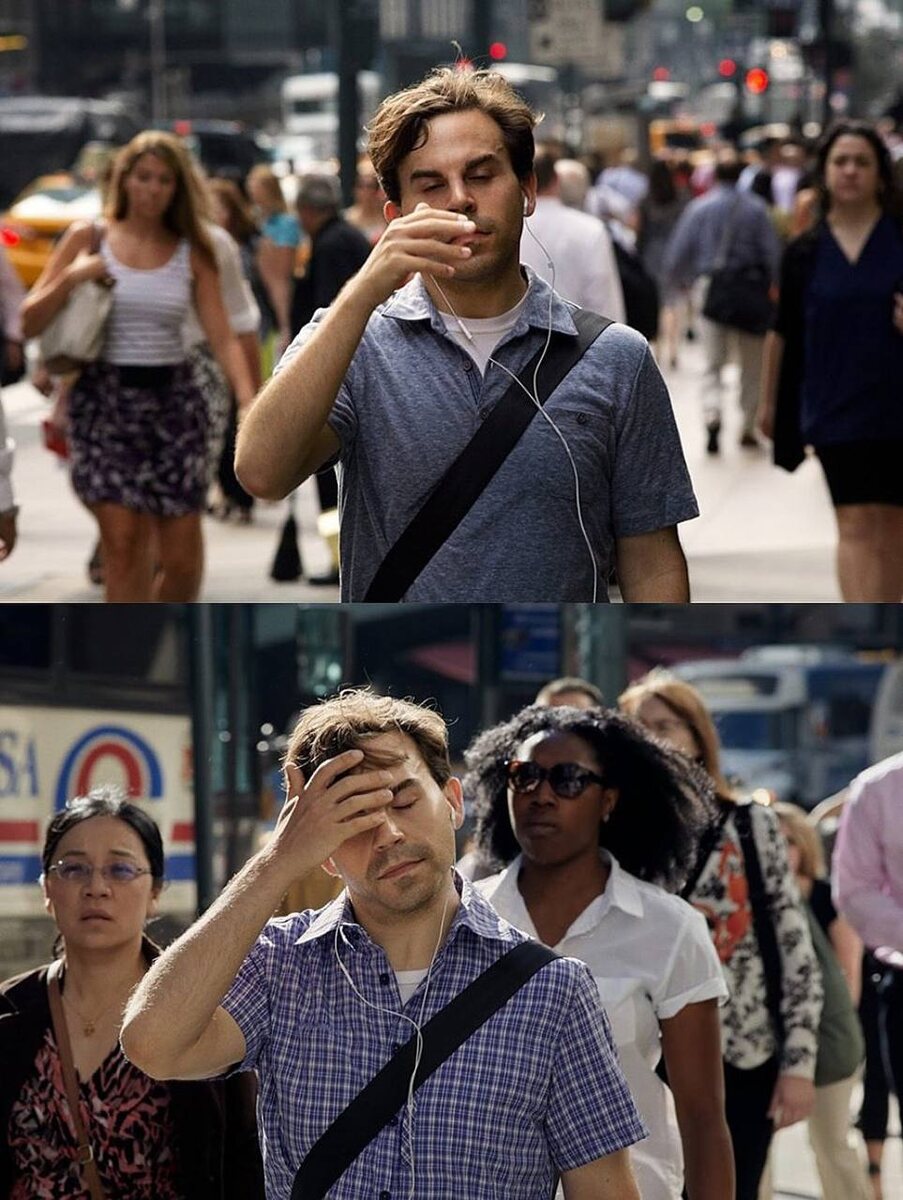 Каждое утро тысячи людей спешат по Нью-Йорку, почти не поднимая головы. Кто-то идёт на работу, кто-то несёт кофе, кто-то опаздывает в метро. Толпа движется по расписанию, как часы. И вот один человек — датский фотограф Питер Фунч — решил остановить этот поток. С 2007 по 2016 год он приходил на одно и то же место — перекрёсток 42-й улицы и Вандербильт-авеню, прямо рядом с вокзалом Гранд-Сентрал, и часами снимал прохожих. Каждое утро, с 8:30 до 9:30, Фунч фиксировал ритм города. Сначала — просто документировал уличную жизнь: офисные клерки, туристы с картами, курьеры с пакетами, прохожие с кофе навынос. Нью-Йорк — город, где никто не стоит на месте. Но чем дольше он снимал, тем больше начинал замечать странное: люди возвращаются. Те же лица, те же выражения, те же привычные движения. Только дата на календаре меняется. Так появился проект «42nd and Vanderbilt» — фотографическая хроника повторений. Позже Фунч стал сопоставлять снимки, сделанные в разные дни, месяцы, а иногда и годы, и сое