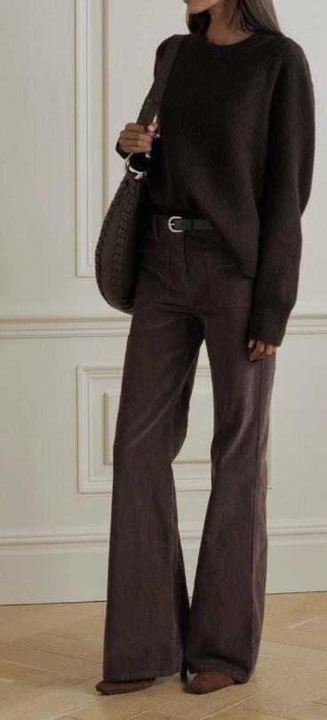 Ключевой принцип стилизации → Поскольку клёш создает объем в нижней части, верх должен быть более лаконичным и структурированным, чтобы сохранить баланс в силуэте. Для прохладной погоды идеальной верхней одеждой станут короткая косуха, приталенный тренч или пальто прямого кроя.