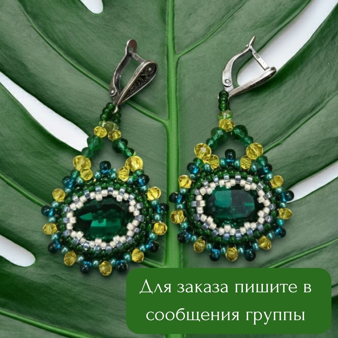 Серьги с изумрудным кристаллом. В оплетении бисера и жёлтых бусин. Обработка фото-https://vk.com/anna.copywriter