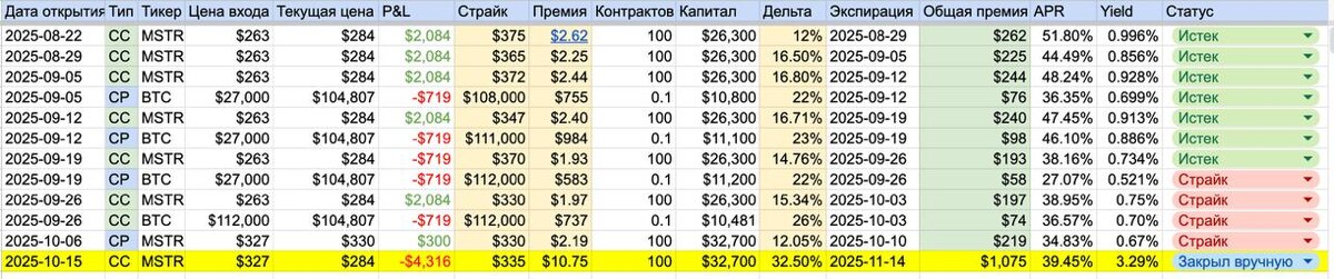 Сегодня решил зафиксировать прибыль по covered call на MSTR. Напомню механику: я продал колл-опцион со страйком 335, получив премию $10.75 за акцию. Сейчас этот же опцион стоит $7.00 — он подешевел, потому что цена MSTR пошла вниз, а время работает в пользу продавца. Соответственно, я просто откупаю его обратно дешевле и забираю разницу. Прибыль — $3.75 на акцию, или $375 на контракт. Почему решил закрыть сейчас? Потому что на рынке неопределенность, а я не хочу превращать зафиксированный профит в потенциальный убыток. Целый год сидел в позиции по MSTR, постепенно наращивал доход, и сейчас логичнее защитить результат. Может еще отскочит, но на АТХ рассчитывать я бы не стал. Логичнее сыграть в защиту. Акции после продажи кола освобождаются — они снова мои, и я их перевожу в кэш. Дальше, возможно, посмотрю в сторону продажи путов, но только самых консервативных, с дельтой ниже 0.1. Сейчас путы дорогие — спрос на страховку от падения высокий, и на этом можно спокойно зарабатывать,