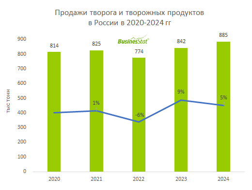 По данным «Анализа рынка творога и творожных продуктов в России», подготовленного BusinesStat в 20215 г, за 2020-2024 гг их продажи в стране выросли на 9%: с 814 до 885 тыс т.