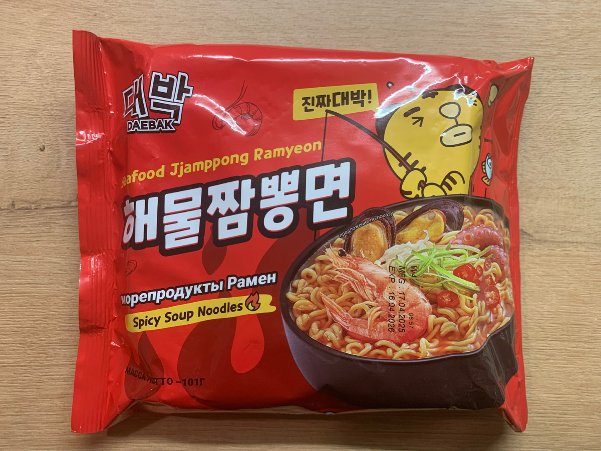 Очередной острый бичик попался мне на глаза при посещении перекрестка. Цена весьма гуманная - 89 рублей за 101 грамм. Производство: Малайзия, но разработано в Корее, как написано на обратной стороне пачки. Состав нормальный, без особого «борща» в плане химии. Порошок из морепродуктов, это из панцирей креветок, обычно. Так что не осьминоги уж точно. Чили присутствует, так что должно быть с остринкой. В пачке сама лапша, порошок со специями, и сушеные овощи. Варить все это вместе нужно 4-5 минут. Получилось весьма неплохо. Лапша вкусная, упругая. Бульон насыщенный, остренький, в самый раз. Попадаются даже кусочки перца чили, что редко бывает в бюджетных бичиках. В общем, за 89 рублей могу рекомендовать. Намного лучше «По-домашнему острого» Роллтона.