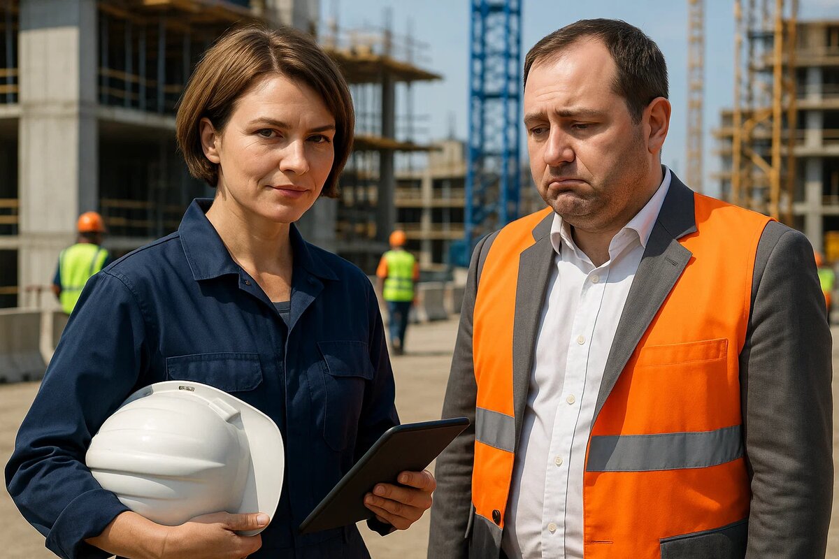 Нашёл у подъёмника. Она говорила с прорабом, показывала что-то на планшете — быстро, чётко. Прораб кивал, записывал. Вокруг неё всё двигалось слаженно.