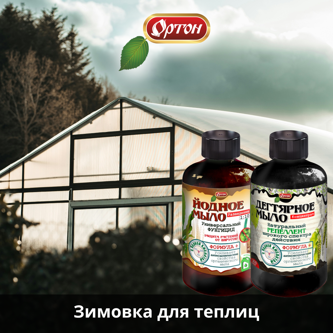 Чтобы теплица хорошо перезимовала и встретила весну готовой к новому сезону, необходимо еще с осени провести ряд мероприятий: ✅ Удалите их теплицы все органические остатки, которые могут стать базой для размножения вредителей и фитопатогенов. ✅ Проверьте теплице на наличие повреждений и выполните мелкий ремонт. ✅ Используя раствор «Йодного мыла» и «Дегтярного мыла» промойте все поверхности, двигаясь сверху-вниз, чтобы избежать повторного загрязнения. Специалисты рекомендуют использовать для этого экологичные препараты на основе натуральных веществ, которые не содержат токсичных химикатов и не загрязняют почву. «Йодное мыло» от компании «Ортон» — это мощный антисептик, который эффективно действует против бактерий, грибов и вирусов, а также нарушает жизненные функции мелких насекомых. Препарат обладает бактерицидным, фунгицидным и вирулицидным эффектом. Подходит для дезинфекции поверхностей и садовых инструментов, а также помогает сохранить урожай от гнилей. Йод является универсальным де