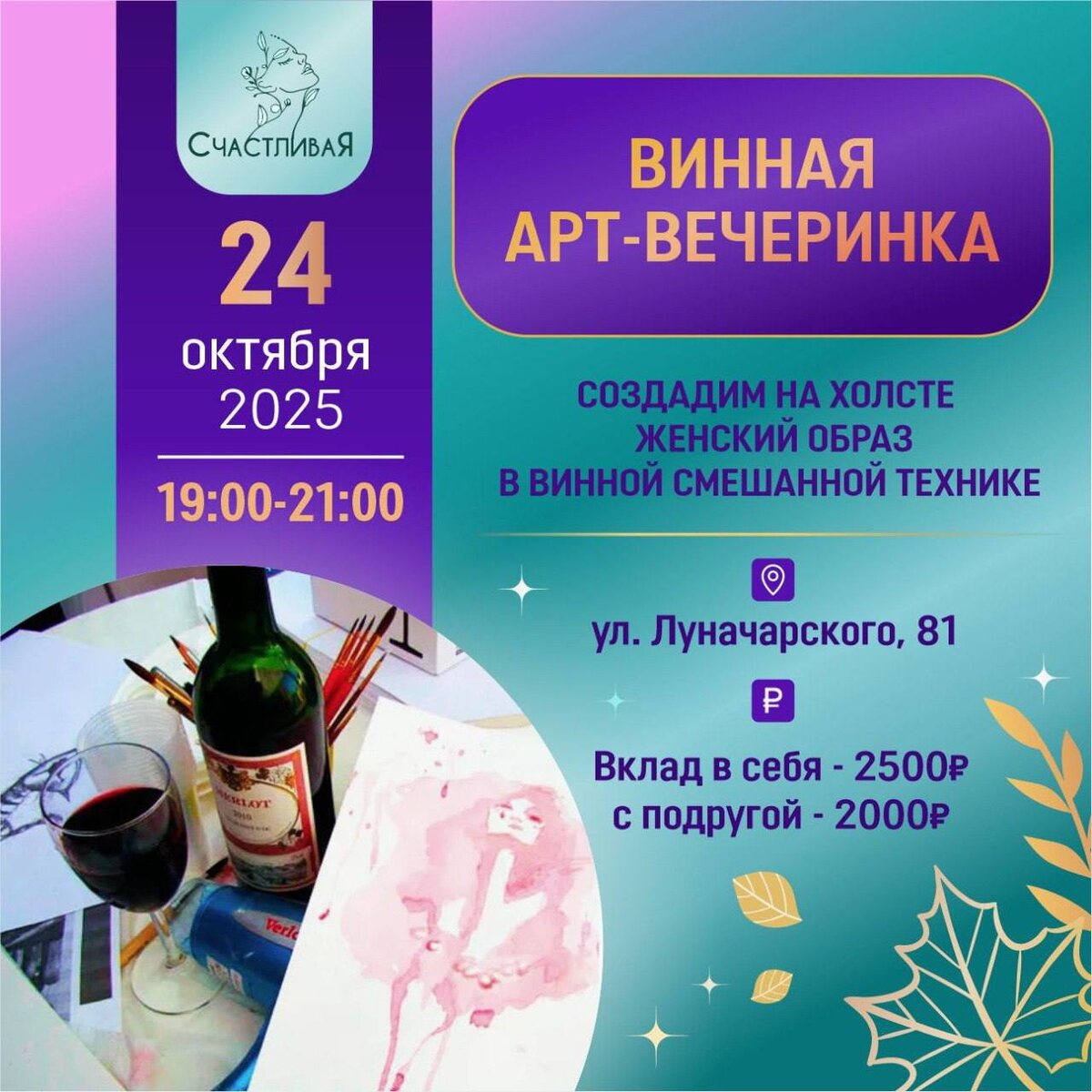 ❤️❤️❤️❤️❤️❤️🍷 ❤️❤️❤️ ❤️ ❤️❤️❤️❤️❤️❤️❤️❤️❤️ ❤️ Рецепт, как отлично провести уютный осенний вечер пятницы! ❤️Приглашаем вас окунуться в атмосферу вдохновения, творчества и изысканного вкуса вина! ❤️Этот особенный вечер подарит вам уникальную возможность создать собственную художественную работу, насладиться обществом прекрасных женщин и зарядиться позитивной энергией. За творчеством, в женском атмосфере и с вином!🎨 ❤️ ЧТО ВАС ЖДЕТ: ❤️Создадим на холсте женский образ в винной смешанной технике🙂 под руководством профессионального художника ❤️Уникальная атмосфера женской энергии и тепла ❤️Приятное общение и дегустация качественного вина ❤️Уютное пространство, наполненное светом свечей и ароматом красок ❤️ ПОЧЕМУ СТОИТ ПРИСОЕДИНИТЬСЯ? ❤️Возможность раскрыть свой творческий потенциал ❤️Шанс познакомиться с интересными людьми и завести новые знакомства ❤️Прекрасный способ расслабиться после рабочей недели ❤️Незабываемые впечатления и красивая картина, созданная своими руками. 🗓