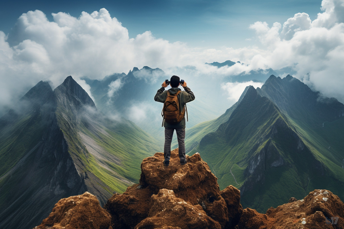 Мне сразу приходит в голову человек с биноклем. Он стоит где-то высоко на горе. И оттуда, с высоты птичьего полета, смотрит на окружающую его действительность. А эти просторы - необъятны и прекрасны. Где-то они очень родные и близкие, а в чем-то еще не покорены и даже, совсем незнакомы. Но все равно, все что видит этот человек - относится к нему, потому что он непосредственно является обозревателем и участником общего процесса существования.