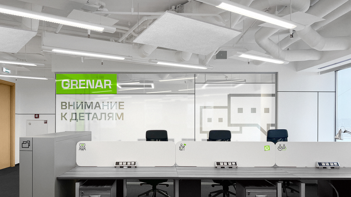 Grenar — маркетплейс запчастей для сельхоз- и спецтехники; правопреемник ведущей европейской компании Kramp, которая более 16 лет успешно работала в России, предлагая запчасти для аграрного сектора. Перед оформлением офиса мы провели ребрендинг компании, разработав новый фирменный стиль. Его основой стали насыщенный зелёный цвет и модульная система, вдохновлённая упорядоченными полками супермаркета. Наша задача заключалась в создании рабочей среды, которая сочетала бы функциональность и отражала новый стиль и ценности бренда. В процессе разработки фирменного стиля мы провели серию интервью с клиентами Grenar, чтобы выяснить их предпочтения и восприятие бренда. Результаты исследований легли в основу позиционирования Grenar как «Супермаркета запчастей», где можно легко найти все необходимое, сравнить варианты и совершить покупку без лишних сложностей. Метафора супермаркета подчеркнула ключевые ценности бренда: простоту, доступность и инновационность. Дизайн офиса Grenar стал физическим в