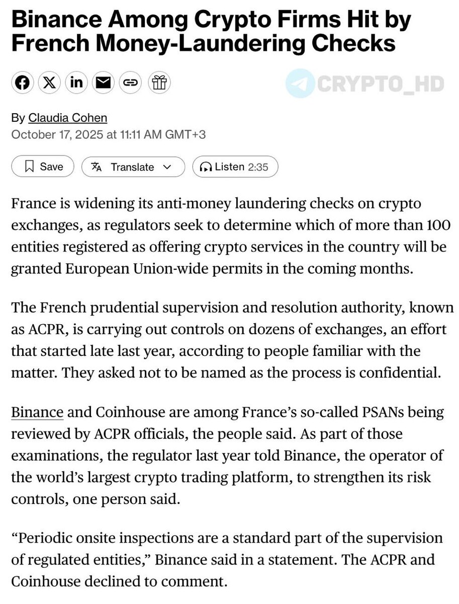 ❌🇫🇷 Bloomberg: Binance – одна из криптовалютных компаний, подвергшихся проверкам франзуских регуляторов на предмет отмывания денег.
