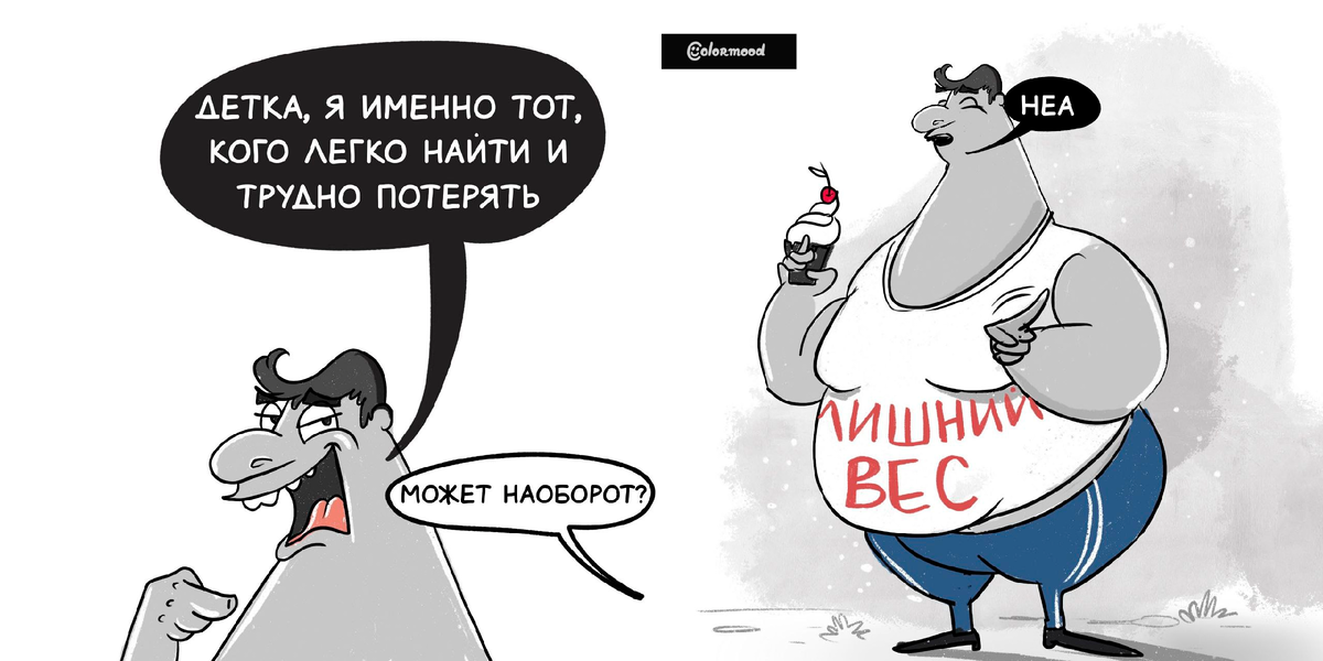 Если вам когда-нибудь приходилось отказываться от сладкого или садиться на диеты, то вы наверняка сможете понять чувства героев комиксов в сегодняшней подборке. Ведь на этот раз вас ждут 10 забавных зарисовок о лишнем весе и похудении - для всех, кто иронично смотрит на мир и готов посмеяться даже над теми темами, которые порою принято умалчивать. Надеюсь, что эти картинки поднимут вам настроение! Российская художница под псевдонимом Colormood известна в сети благодаря своим комиксам о волке, который постоянно что-то съедает. Но есть и много комиксов на другие - самые разные темы. К примеру, одна из зарисовок посвящена персонажу, с которым вряд ли кто-то хотел бы повстречаться. Российская художница под псевдонимом KoDa - создательница проекта Обитель Золотого Дракона - рисует яркие и очень смешные комиксы об огнедышащих ящерах. Драконы в этих зарисовка получаются очень даже человечными, потому что им совсем не чужды обычные проблемы - вроде желания съесть что-то большое и вредное. В