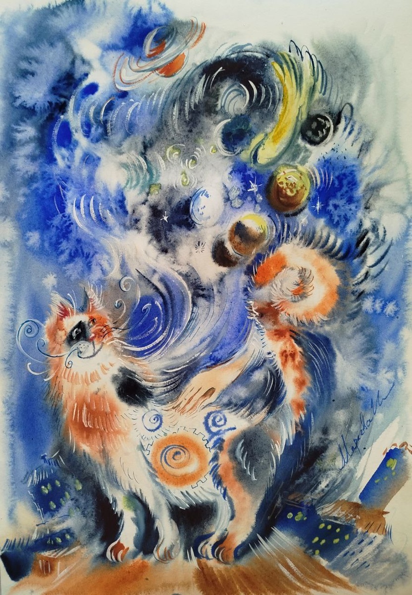 " Понимаешь, еще мой Прапрадед придумал эту шутку. Он установил внутри кошек такие маленькие моторчики, они ускоряются, если кошку погладить. Понимаешь, когда человек гладит кошку, он будто невидимым ключиком заводит Вселенную и она начинает дергать ручками и ножками энергично и задорно. И даже немножко тренькает. Вот сейчас было, слышишь?
