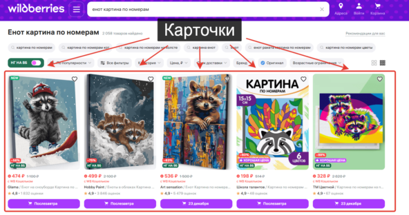 Начало статьи читайте здесь. Когда человек что-то ищет, например, на WB, ему в выдаче показываются карточки. Человек пишет в поиске, например, «картина по номерам енот». Если он кликнет на какую-нибудь карточку в выдаче и купит товар, WB это понравится. И когда кто-то другой напишет в поиске «картина по номерам енот», эта карточка будет показываться выше, чем человеку, который покупал её до. А кто-то другой напишет «картина по номерам подарок». И совсем не будет покупать с этой карточки. WB такой: «ага, я не хочу тратить внимание пользователя на то, что он не покупает». И опустит карточку по этому запросу. Так работают алгоритмы продвижения на WB: чем больше покупок и чем выше конверсии в покупку, тем выше карточка в выдаче. А если данных по карточке нет, WB смотрит средние значения в сегменте и определяет место карточки относительно них. Продажи на WB есть где-то до 30 места в выдаче. Дальше почти не покупают, там низкие конверсии в покупку. Получается, если будешь сидеть ниже 30 мест
