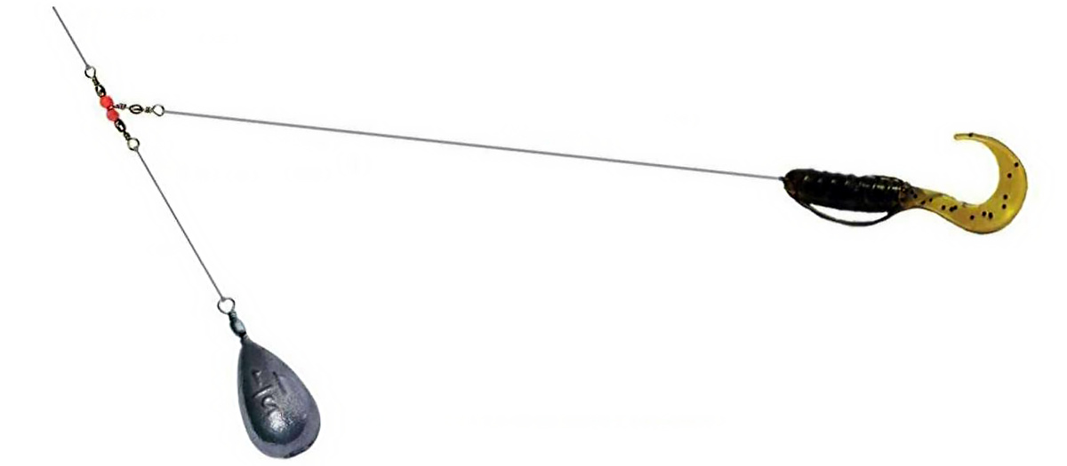 Схема изменилась: отступ от груза 10-12 сантиметров, поводок к крючку 80-90 сантиметров, приманки небольшие 5-6-сантиметровые твистеры белых и перламутровых расцветок. Проводка — плавные невысокие подбросы с удлинённой паузой 3-4 секунды или волочение по дну.