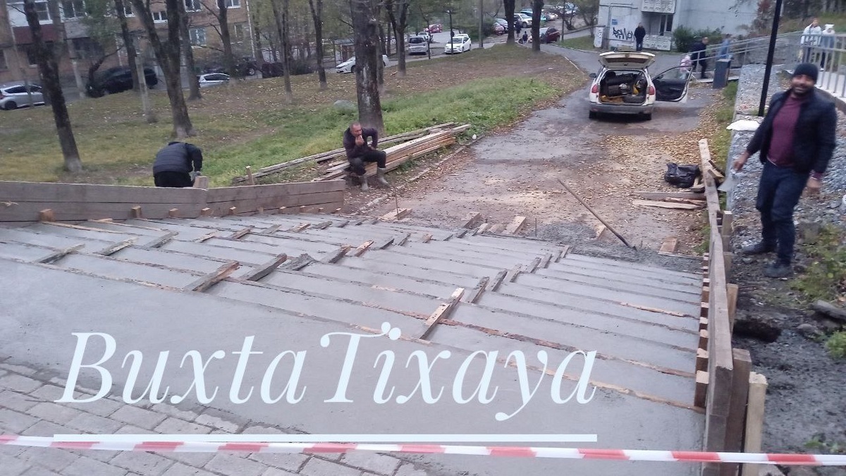 ☺️Уже заливают бетоном будущую лестницу, на Сахалинской аллее.