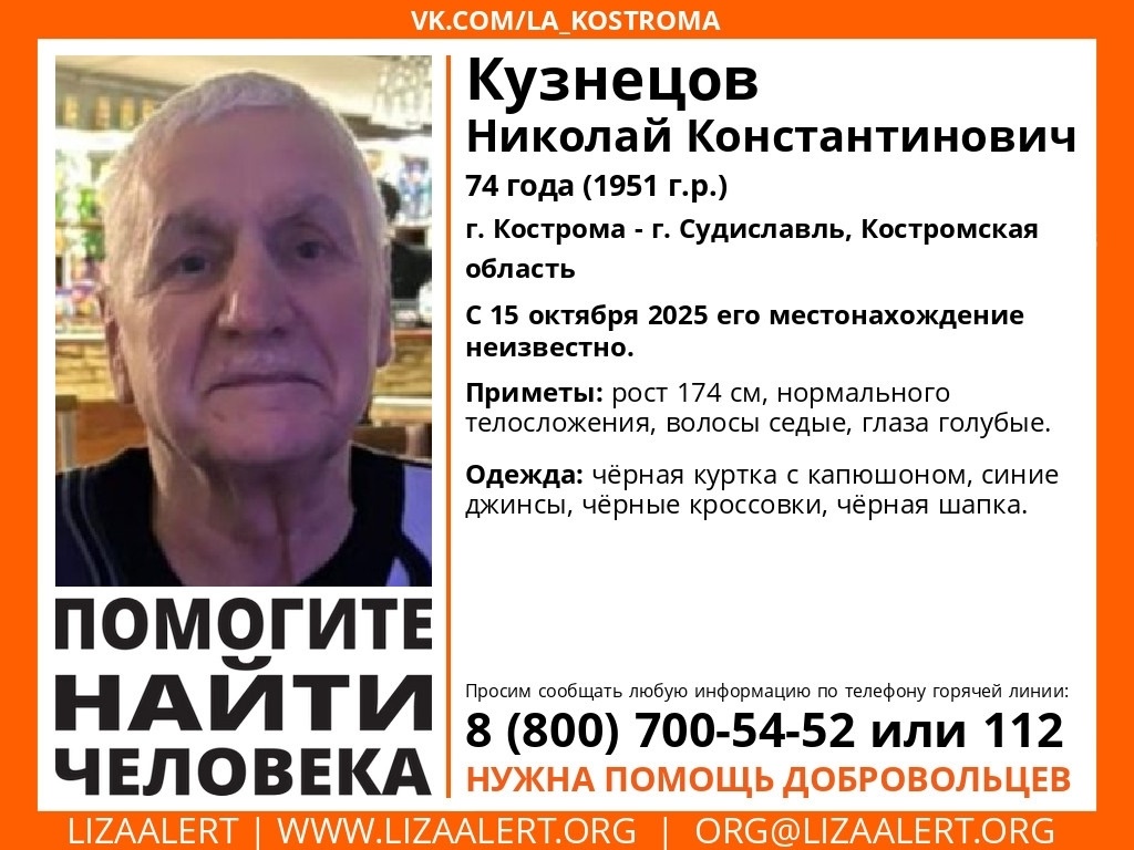 74-летний Кузнецов Николай Константинович, пропавший в Костромской области, мог идти пешком из Судиславля в областную столицу. Костромские поисковики просят автомобилистов, проезжавших по отрезку Судиславль-Кострома, проверить свои регистраторы за вечер 15 октября.