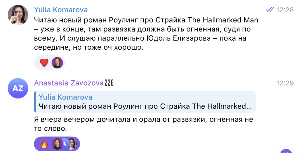 Очень утомили, если честно, страдания Страйка по Робин и постоянные заклинания Робин себе: "Я люблю Мёрфи". Как-то вроде бы взрослые люди, должны понимать, что главное в нашей жизни – это диалог друг с другом: в семье, в бизнесе, в дружбе.