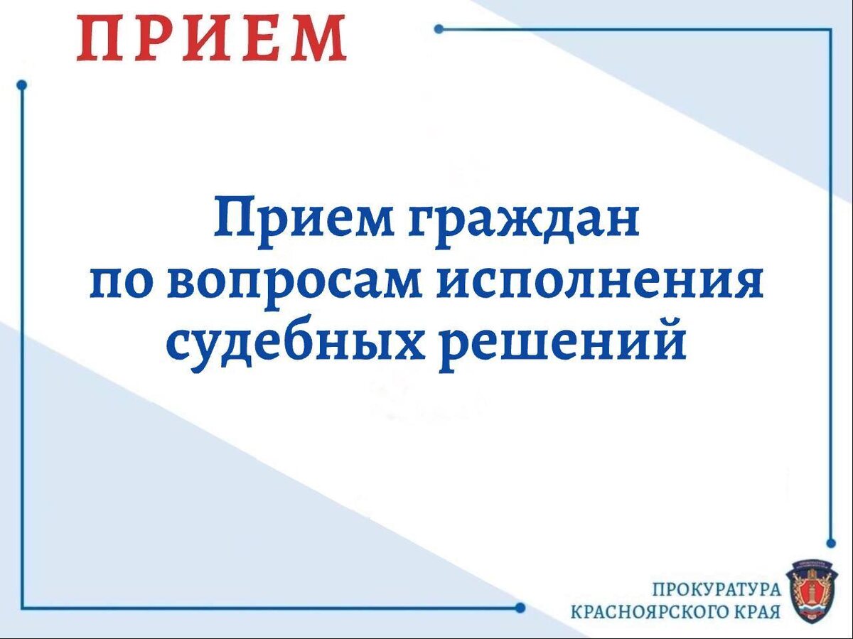 21 октября краевая прокуратура проведет прием граждан по исполнению судебных решений службой судебных приставов в г. Красноярске по адресу: пр. Мира, 32. Запись на прием по тел: 8(391) 222-46-62. 22 октября с 10.00 до 12.00 минусинский межрайонный прокурор Павел Павлов и начальник отделения судебных приставов по г. Минусинску и Минусинскому району Оксана Парфенова проведут тематический прием по вопросам нарушения законодательства об исполнительном производстве в Минусинске по адресу ул. Ленина, 71 (каб. 23). Запись на прием по тел: 8(39132) 2-31-20, 2-31-49. При себе лучше иметь заявление с указанием основных доводов, а при наличии - копии полученных ранее ответов от органов власти, правоохранительных или надзорных ведомств.