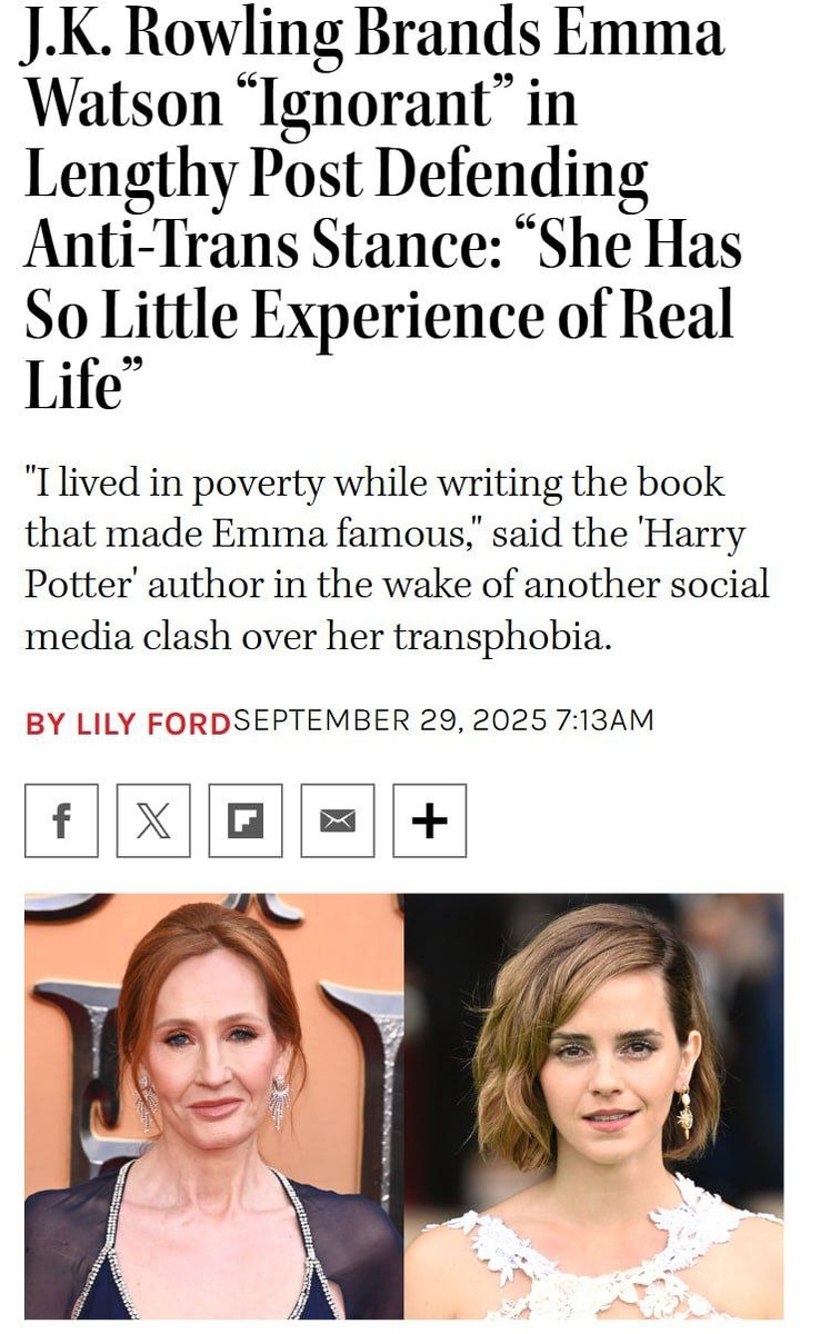 #это не психология Новости из параллельной Хогвартсом реальности: Джоан Роулинг назвала Эмму Уотсон «невежественной». Интернет, естественно, сел в первый ряд и открыл попкорн. Конфликт, если кто пропустил, начался ещё в 2020 году — когда Роулинг высказалась о трансгендерах, а Эмма встала на защиту. Прошло время. В сентябре Уотсон дала интервью: сказала, что всё ещё благодарна Джоан за Гермиону, но не может поддерживать её взгляды. И вот Роулинг — как будто ждала — выдала пост: актёры, мол, не вправе критиковать автора, благодаря которому стали знаменитыми. А Уотсон, по её словам, просто «мало знает жизни». Типа пока ты не лежала в общей палате, не ночевала в приюте и не переодевалась в смешанной раздевалке — сиди молча. Ну что ж. Уровень допуска к дискуссии: страдание. Чем больше страдала — тем громче можешь говорить. Привет, кастинг на роль «достаточно пострадавшего». В этом споре можно кого угодно обвинить в чём угодно. Но факт остаётся: когда не хватает аргументов — начинается