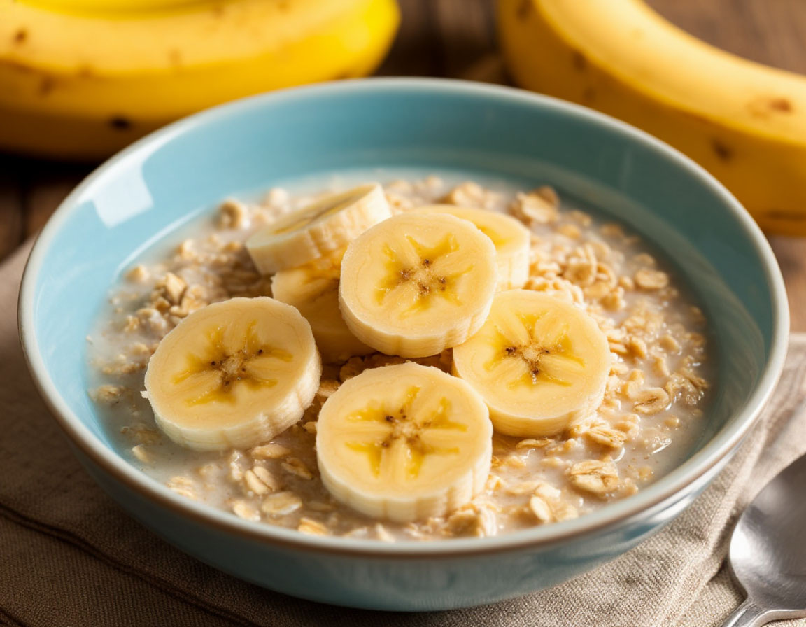 Нарежьте банан по диагонали на ломтики толщиной 2–3 мм. Разложите кашу по тарелкам и распределите сверху ломтики банана.